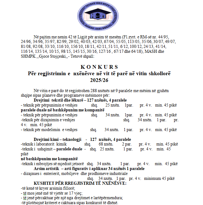 Në pajtim me nenin 42 të Ligjit për arsim të mesëm (Fl.zyrt. e RM-së nr. 44/95, 24/96, 34/96, 35/97, 82/99, 29/02, 40/03, 42/03, 67/04, 55/05, 113/05, 35/06, 30/07, 49/07, 81/08, 92/08, 33/10, 116/10, 156/10, 18/11, 42/11, 51/11, 6/12, 100/12, 24/13, 41/14, 116/14, 135/14, 10/15, 98/15, 145/15, 30/16, 127/16 , 67/17 dhe 64/18), MASH dhe SHMPK ,,Gjoce Stojçeski,,- Tetovë shpall: